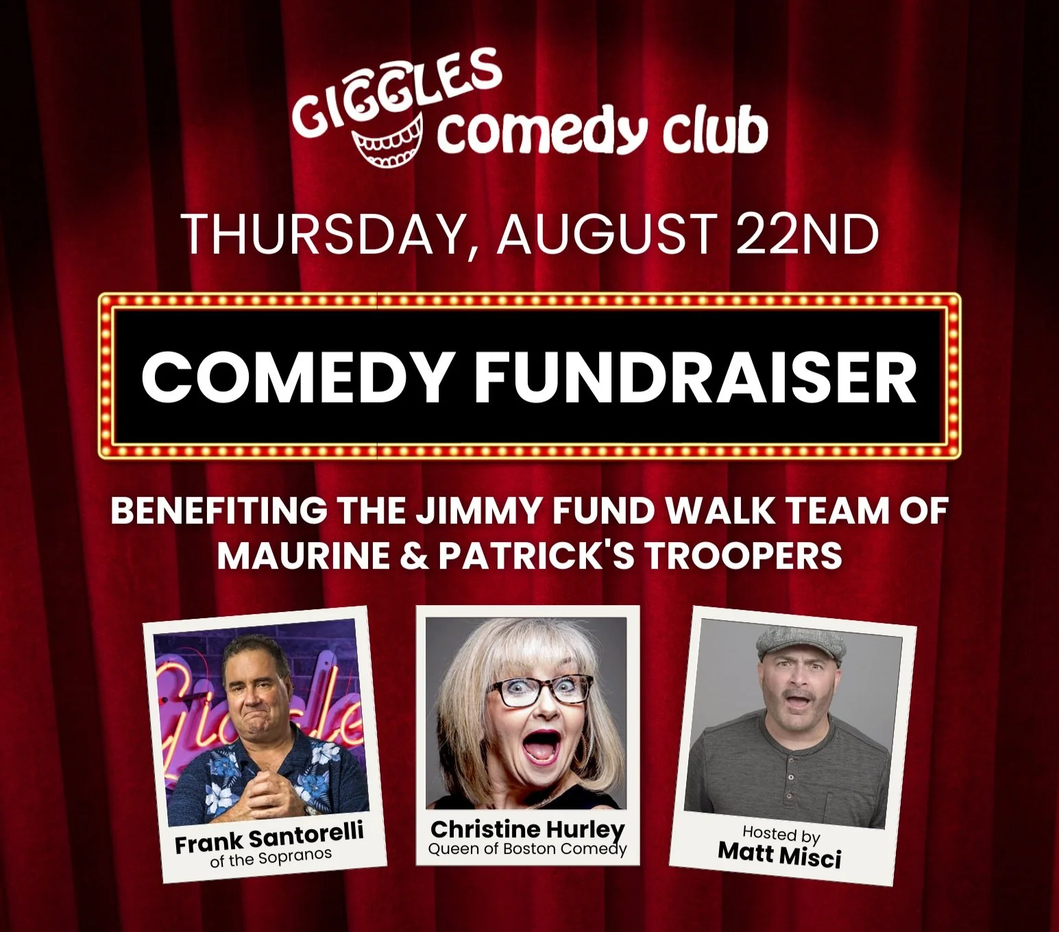 Help us raise funds for our 2024 walk team on Thursday, August 22 at Giggles Comedy Club on Rt. 1. Featuring Boston’s best comedians! Doors open at 6:30pm, with pizza served 7–8pm, and the comedy show starting at 8pm.